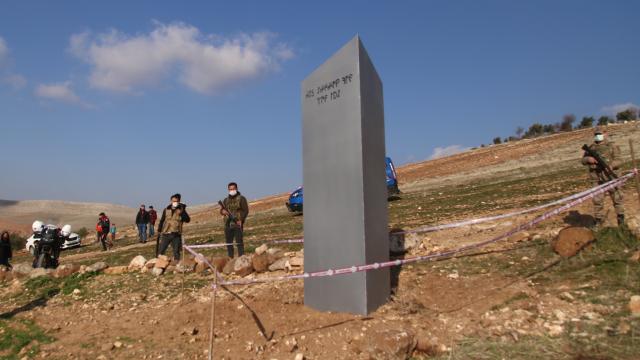 TRT Haber’in haberine göre; günün ilk ışıklarıyla bölgeyi kontrol eden vatandaşlar, yaklaşık 3 metre yüksekliğinde, 1 metre genişliğinde ve üzerinde Göktürk alfabesiyle “Gökyüzüne bak, ayı gör” ifadesinin yazılı olduğu metal blokun yerinde olmadığını gördü.