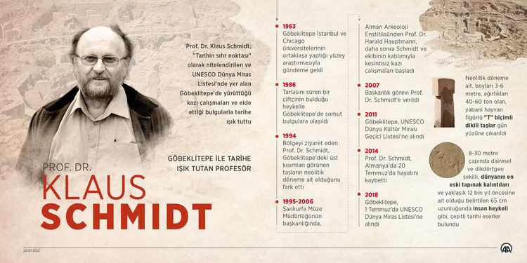 Tarlasını süren bir çiftçinin 1986’da bulduğu heykelin ardından Göbeklitepe’de somut bulgulara ulaşıldığı kaydedilen açıklamada, 1994’te bölgeyi ziyaret eden Alman Arkeoloji Enstitüsünden Prof. Dr. Schmidt’in, Göbeklitepe’deki üst kısımları görünen taşların neolitik döneme ait olduğunu fark ettiği belirtildi. Açıklamada, bunun üzerine 1995-2006’da Şanlıurfa Müze Müdürlüğünün başkanlığında, Schmidt ve ekibinin katılımıyla kesintisiz kazı çalışması yapıldığı bildirildi.