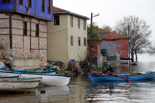 Uluabat Gölünde kayık kiralayan ziyaretçiler, evlerin önüne kadar gelen göl sularının üzerinde ”Venedik”i andıran eşsiz doğanın keyfini çıkarıyor.