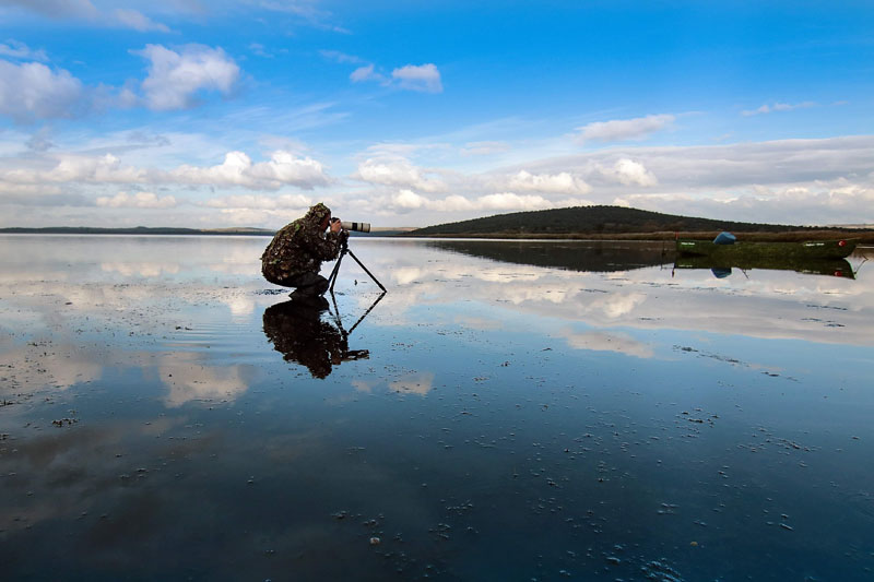Turhan, sabahın ilk ışıklarında kamufle olarak göle girip çekimlerini büyük bir titizlikle gerçekleştiriyor.