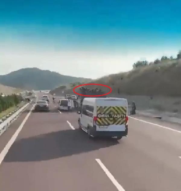 Kamyonun kasasında yolculuk yapan kaçak göçmenler, brandayı kesip kasadan atlayarak otoyol kenarındaki ağaçlık alana kaçtı. O anlar, bir yolcu otobüsündeki yolcular tarafından cep telefonu kamerasıyla görüntülendi.