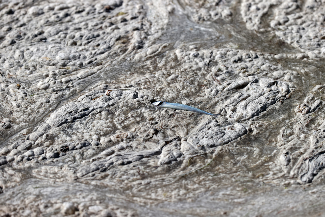 Su yüzeyindeki köpüksü tabakada bazı küçük balıkların cansız oldukları gözlendi.