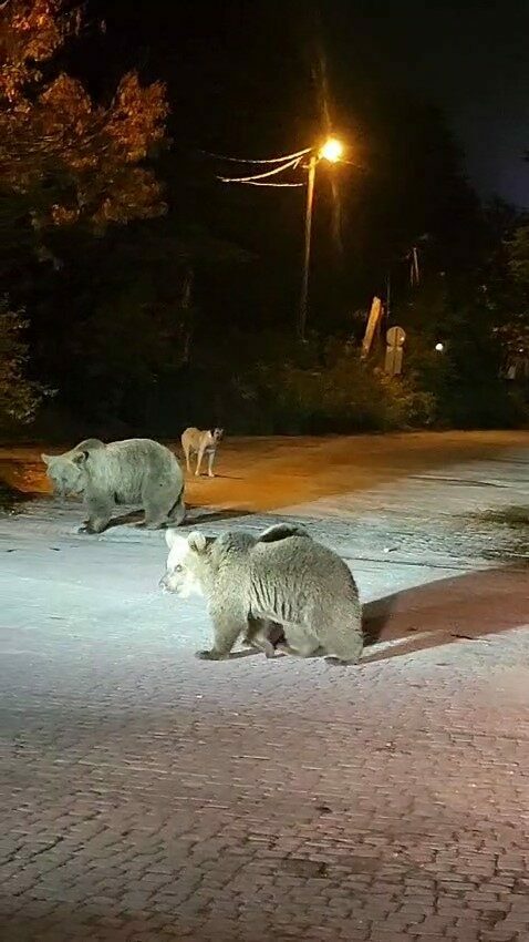 Sokakta aniden karşılarına çıkan anne ayı ve iki yavruyu gören dağcılar, paniğe kapılmadan durumu soğukkanlılıkla yönetti.