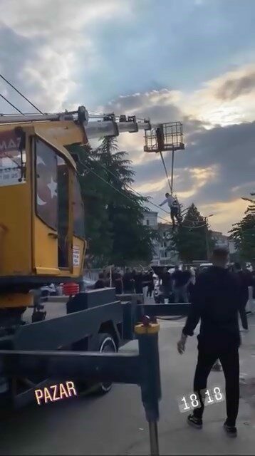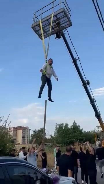 Damadın arkadaşları kiraladıkları vinç ile damadı iple sallandırdı.