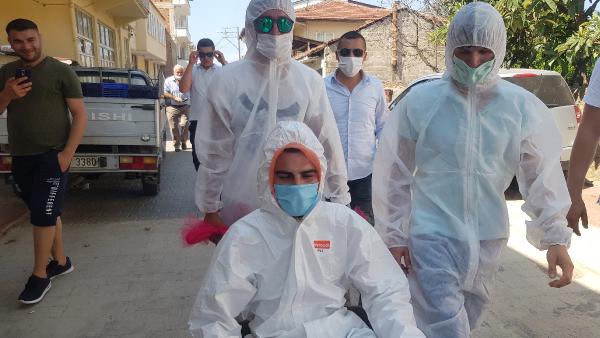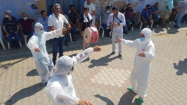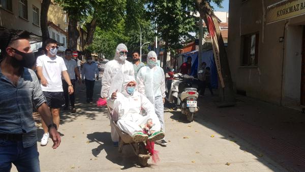 Çiftçilik yaparak geçimini sağlayan Emre Ede (25), Aysu Usta ile dünya evine girdi. Gelin alma merasiminde Emre Ede’nin arkadaşları, ilginç geleneklerle damada zor anlar yaşattı. Salgın nedeniyle damada sağlık personelinin kullandığı tulum giydirildi. Damat, davul zurna eşliğinde meydanda oynadı, ortaya renkli görüntüler çıktı.