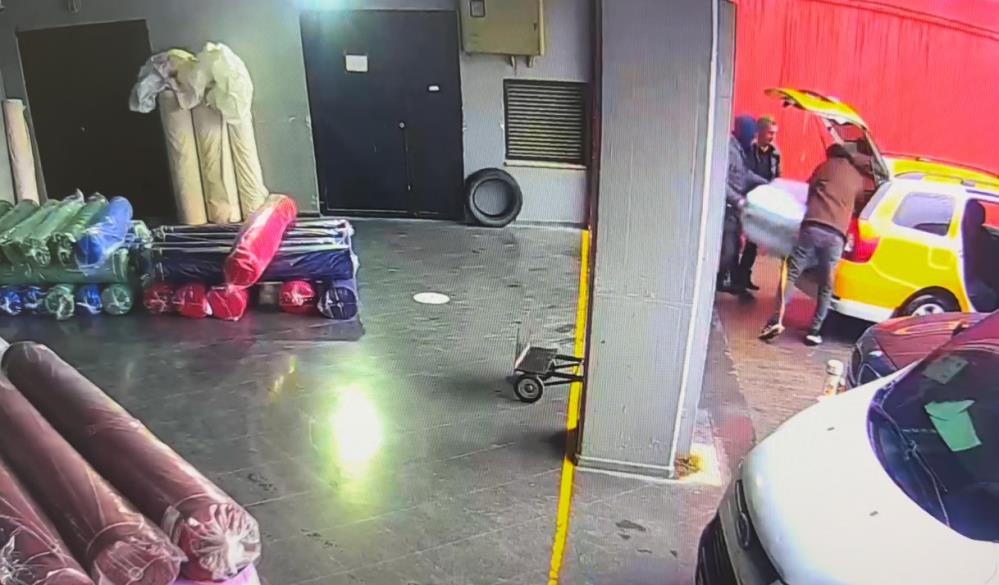 Bir süre içeride dolaşan şüpheliler, sevkiyata gidecek olan ve içi kumaş dolu çuvalı, çağırdıkları ticari taksi ile çalarak kayıplara karıştı.