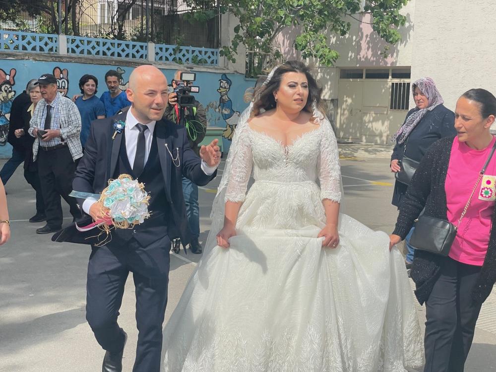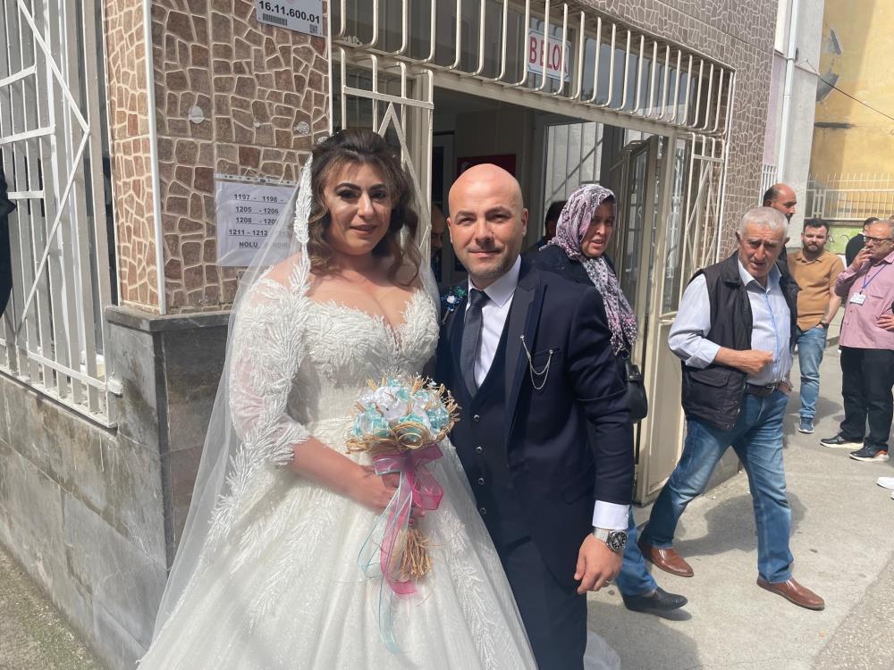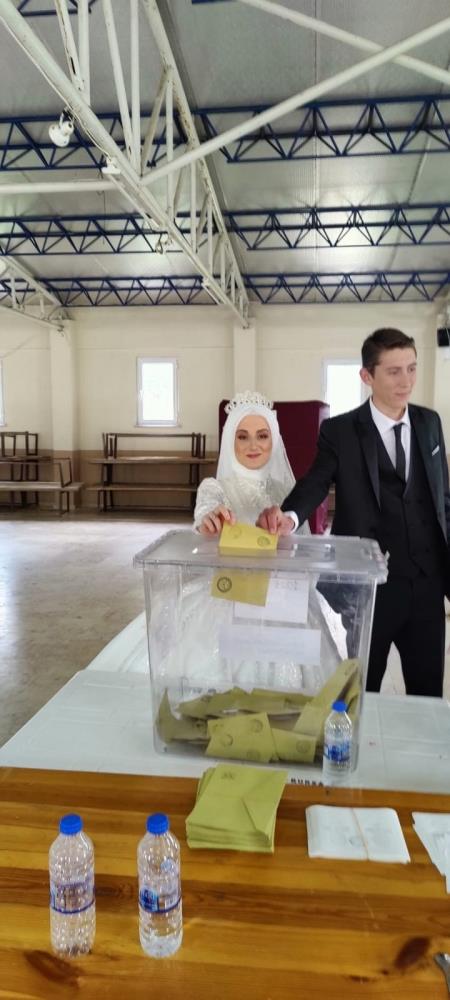 En renkli görüntüler de bugün düğünü olan yeni çiftlerin gelinlik ve damatlık ile oy kullanması sırasında yaşandı.
