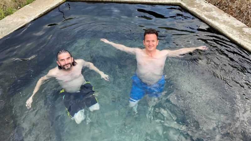 Soğuk havada derede yüzen vatandaş soğuk sudan çıkıp kendini sıcak kaplıca havuzuna atıyor.