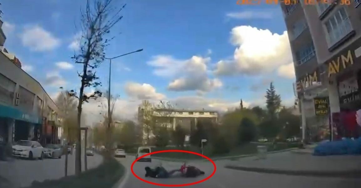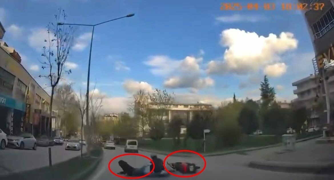 Yoldan kalkan 2 kişi, savrulan motosikletin yanına giderken, o anlar araç kamerasıyla görüntülendi. (DHA)