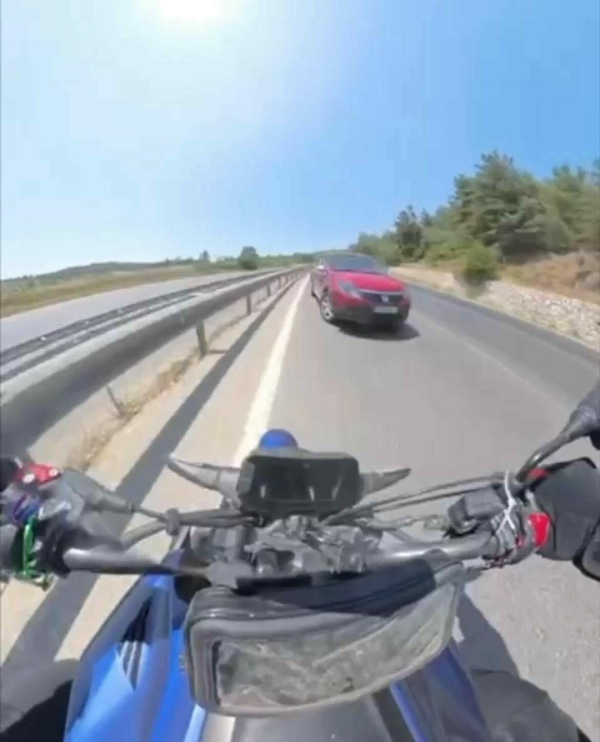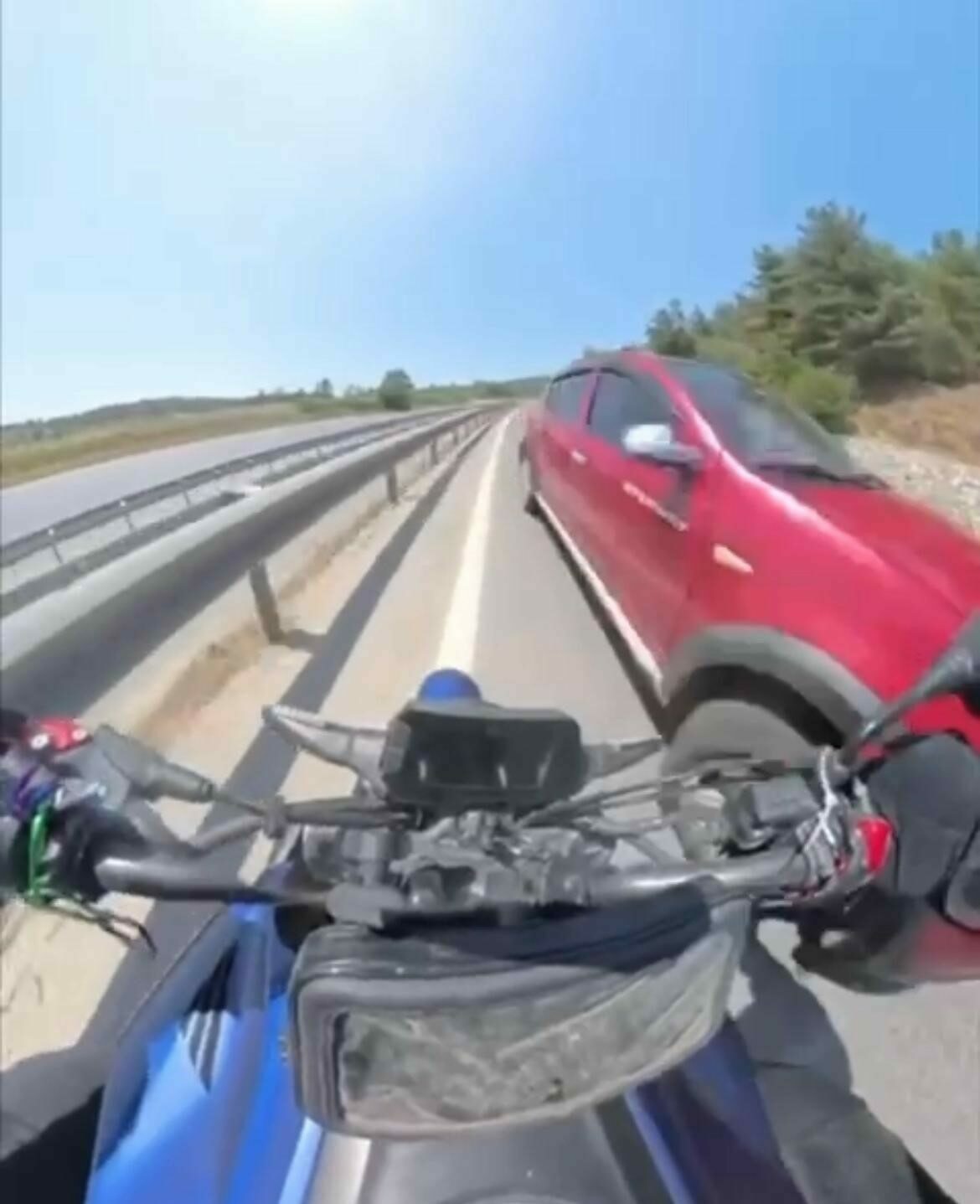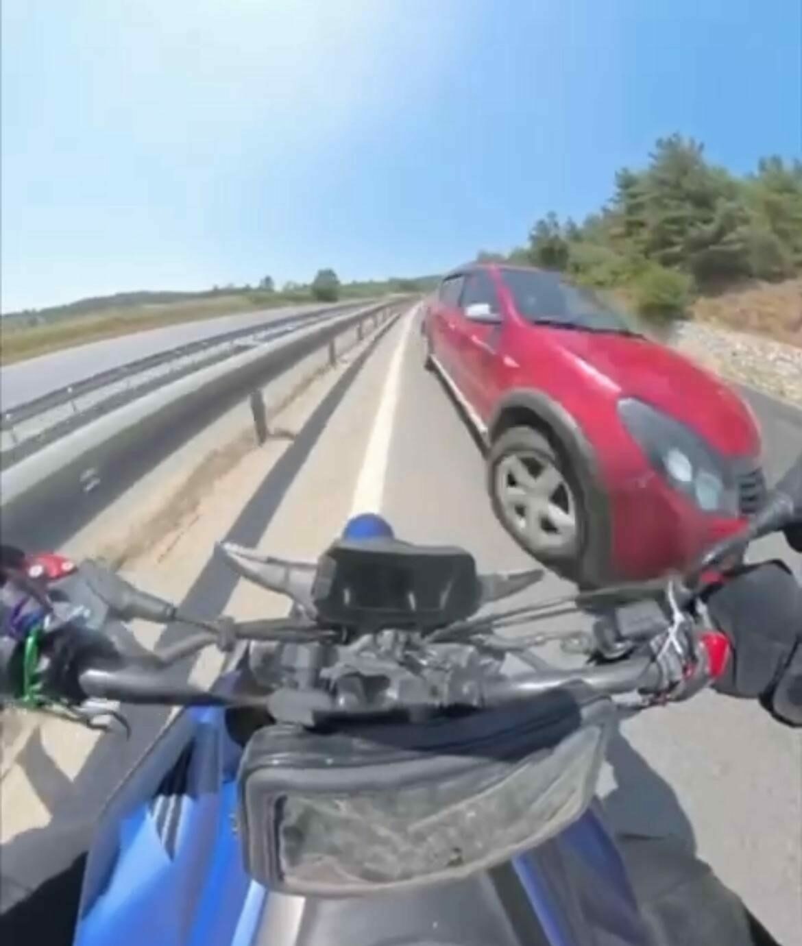 Ters yönde ilerleyen otomobil sürücüsüne tepki gösteren motosikletli, görüntüleri sosyal medyada paylaşarak duruma dikkat çekti.