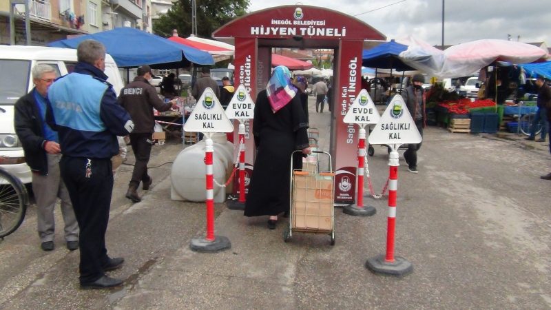 Vatandaşlar, pazar alanına zabıta ekiplerinin kurduğu dezenfekte tünelinden geçerek alındı. Maskesi olmayanlara ise maske dağıtıldı.