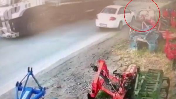 Kamyondan düşen ruloya çarpmaktan son anda kurtuldu
