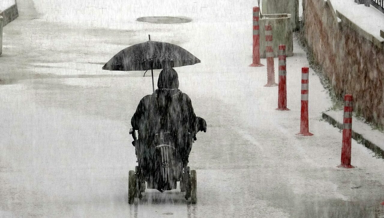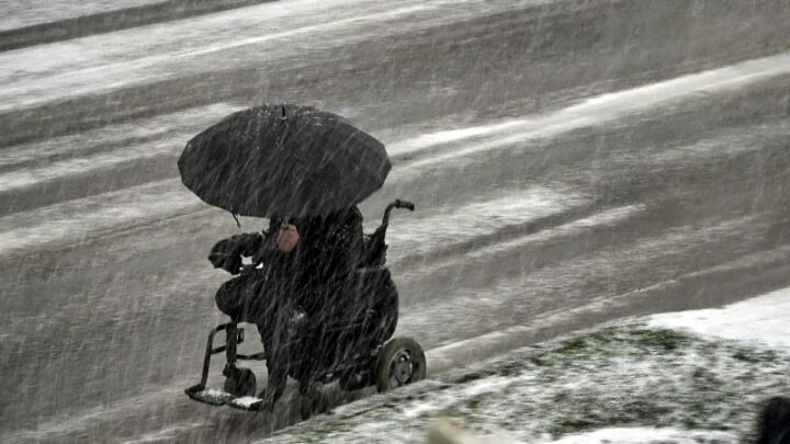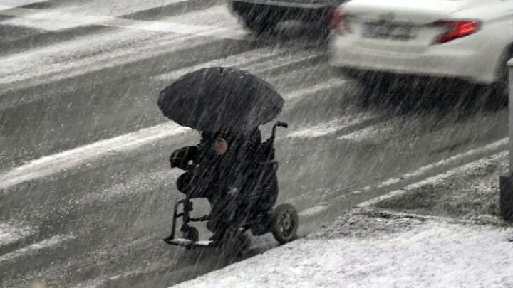 Buz kaplı yollarda tekerlekli sandalyesi ile ilerleyen A.C., kar yağışından ise elindeki şemsiye ile korunmaya çalıştı.