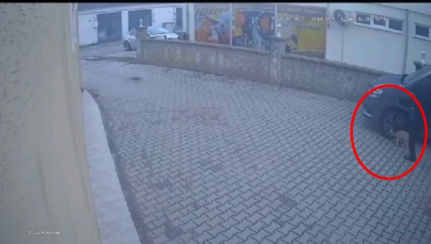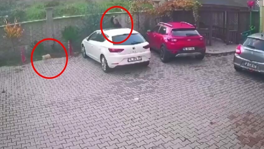 O anlar, sitenin güvenlik kamerasına yansıdı. Tekmenin ardından köpek kaçarken, şüpheli olay yerinden uzaklaştı.