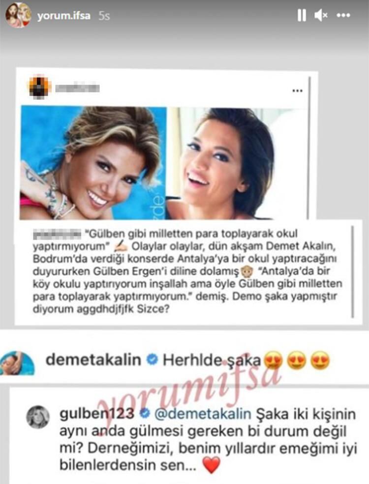 Demet Akalın, sosyal medyada bir magazin hesabının yayınladığı, “Demet Akalın, Gülben Ergen’i diline dolamış. Demo şaka yapmıştır. Sizce?” mesajına yorum yazdı.