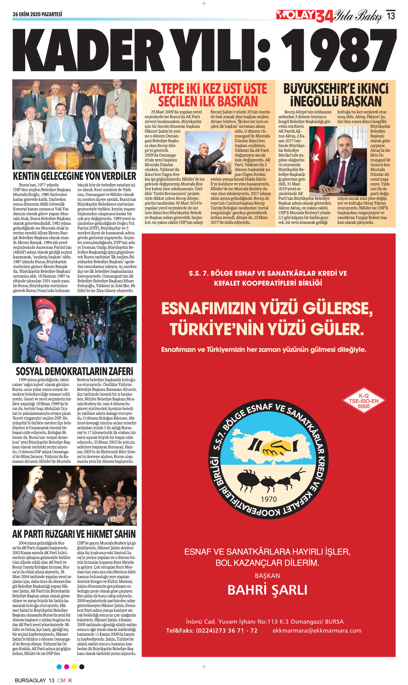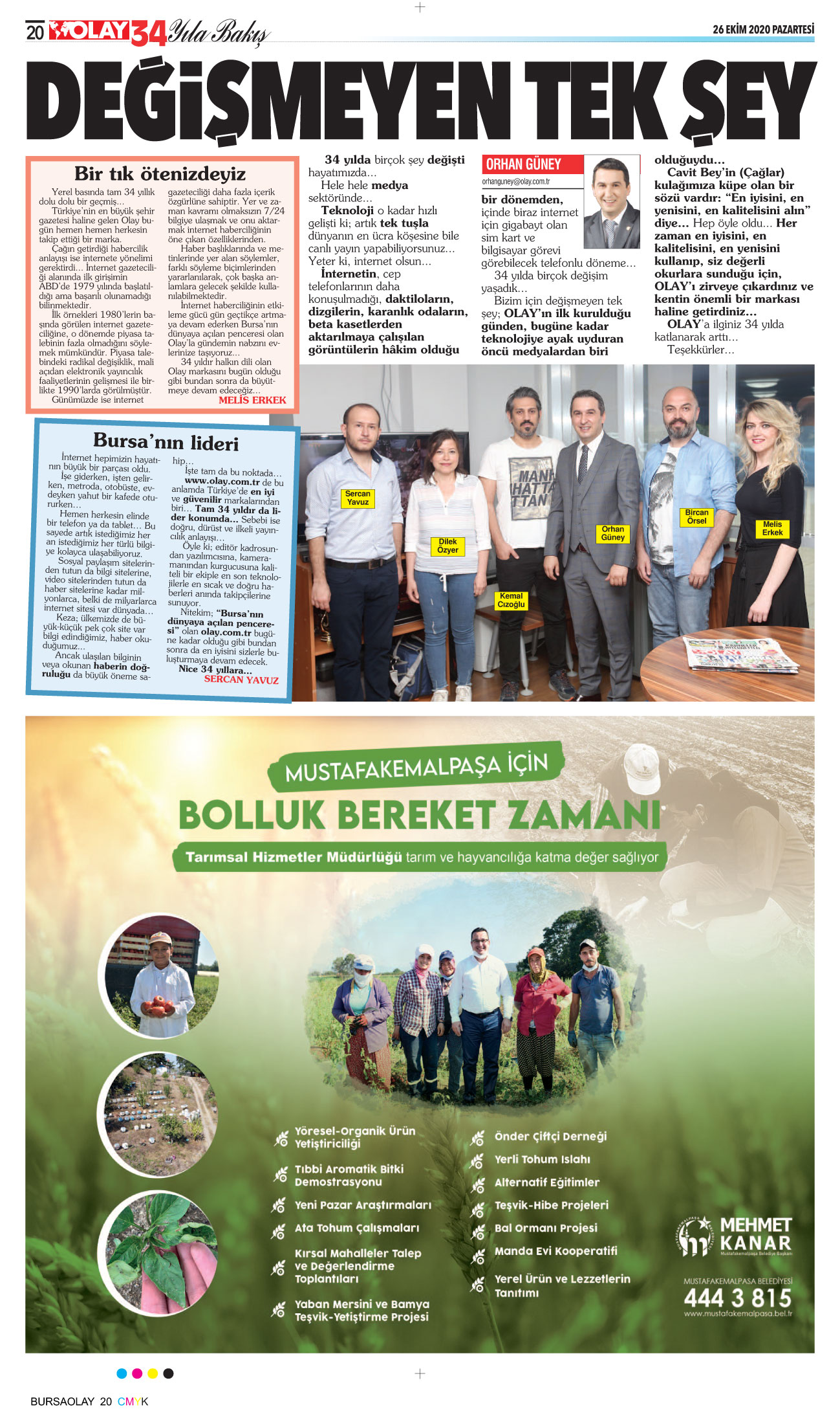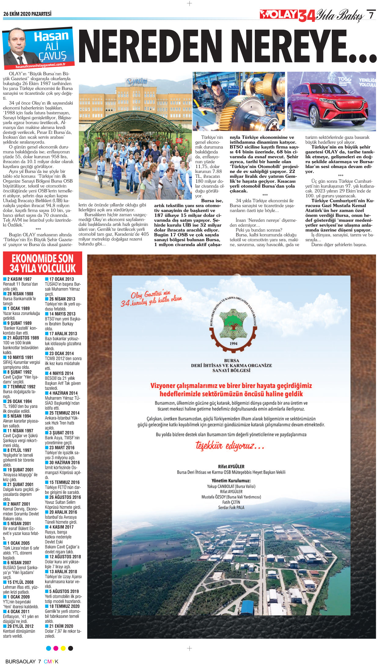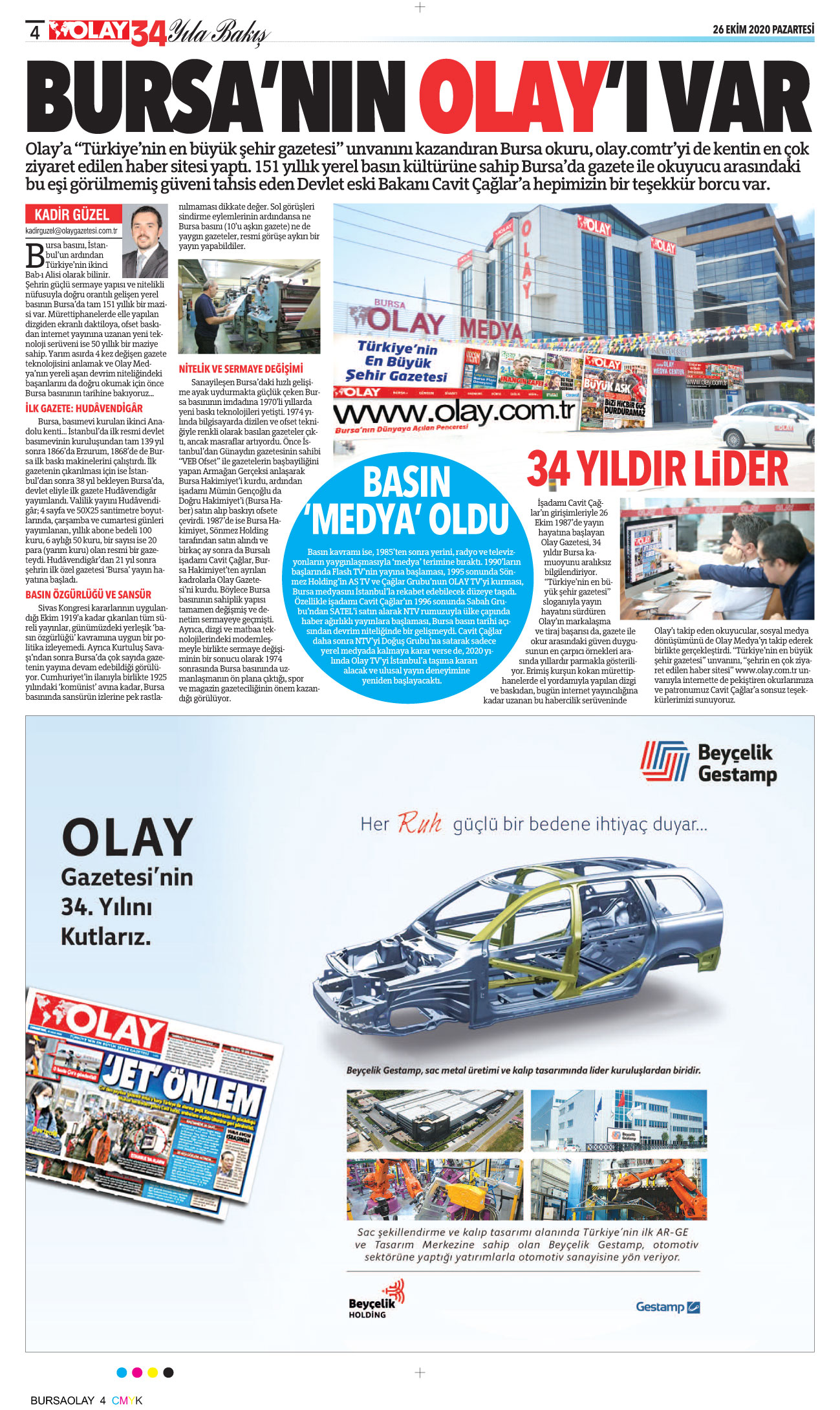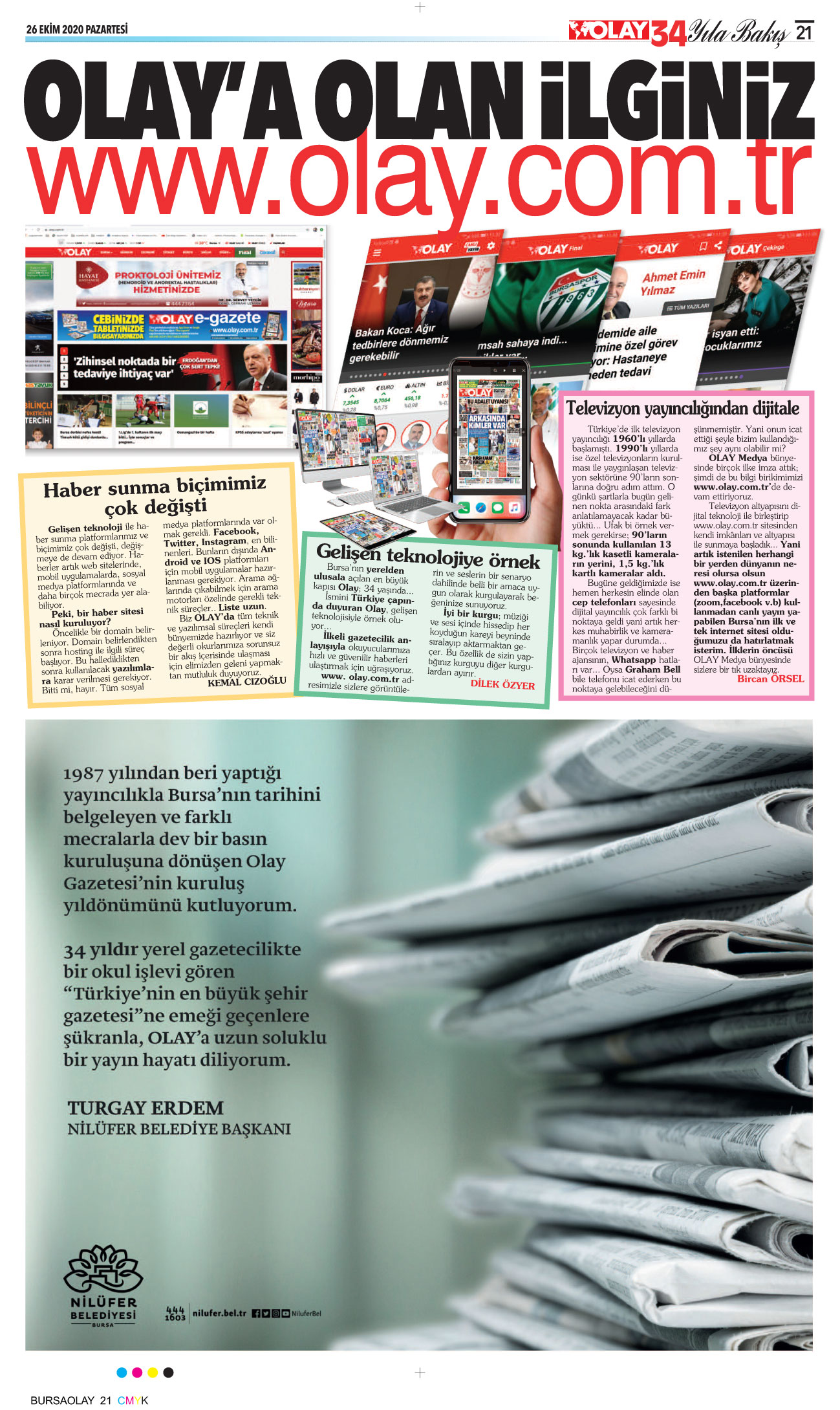 Olay, 34 yıldır Bursa’nın yerelden evrensele açılan en önemli markalarından birisi… Gelinen nokta hepimize çok önemli sorumluluklar yüklüyor. Biz daha iyi bir Türkiye ve Bursa için haberciliğimizden, doğruların peşinden koşmaktan asla vazgeçmeyeceğiz, size de Olay’ınıza sahip çıkmak kalıyor. Bu konuda en ufak bir şüphemiz yok…