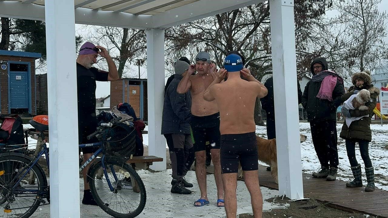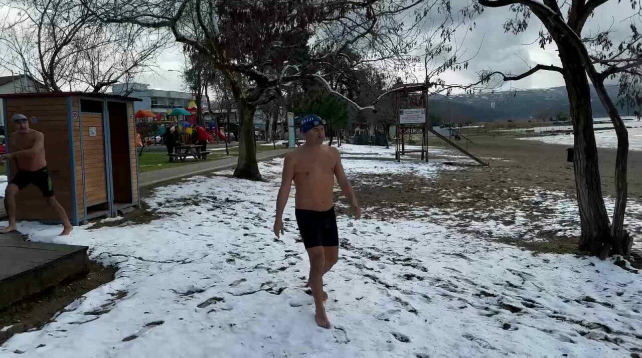 İznik’te kendilerine ’İnciraltı Sanatörleri’ adını veren bir grup, yer yer devam eden kar yağışına ve soğuk havaya aldırmadan İznik Gölü’nde suya girdi. 3 yıldır yaz kış demeden göle giren grup, İznik’te etkisini sürdüren kar yağışı ve eksi 3’ü gösteren soğuk havada geleneği yine bozmadı.