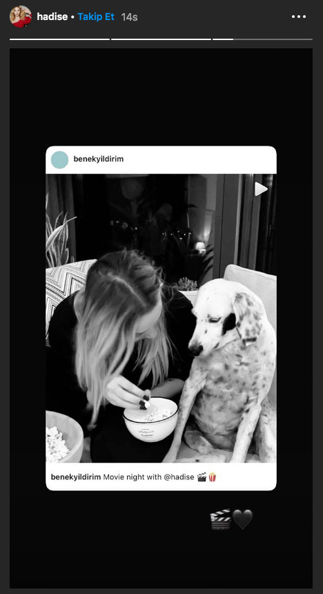 Hadise, Kaan Yıldırım’ın köpeği ile mısır yediğini anları paylaştı. Hadise, Benek’in hesabından yaptığı paylaşıma, “Film gecesi” notunu düştü.