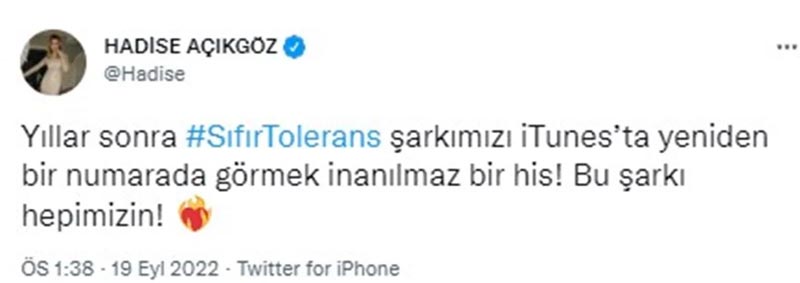 Nisan ayında evlendiği Mehmet Dinçerler’den boşanma kararı alan Hadise’nin “Sıfır Tolerans” şarkısı iTunes müzik listesinde zirveye yerleşti. Sosyal medya hesabından konuya ilişkin açıklama yapan Hadise, ”Yıllar sonra #SıfırTolerans şarkımızı iTunes’ta yeniden bir numarada görmek inanılmaz bir his! Bu şarkı hepimizin!” dedi.