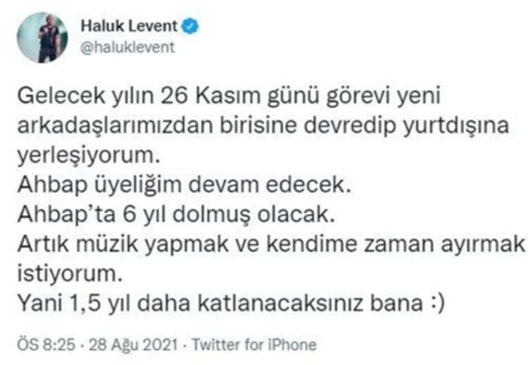Haluk Levent, 28 Ağustos’ta “Gelecek yılın 26 Kasım günü görevi yeni arkadaşlarımızdan birisine devredip yurt dışına yerleşiyorum. AKBP üyeliğim devam edecek. AHBAP’TA altı yıl dolmuş olacak. Artık müzik yapmak ve kendime zaman ayırmak istiyorum. Yani 1.5 yıl daha katlanacaksınız bana” mesajını paylaşmıştı.