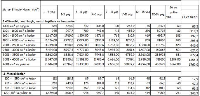 Yeni dönemde motorlu taşıtlar vergileri de yüzde 5.8 oranında artırılacak. 1301 cm3’den 1600 cm3’e kadar olan 1-3 yaşındaki araçların vergisi 945 liradan 997.7 liraya yükselirken, bu hacimdeki 4-6 yaş grubundaki araçların vergisi 709 liradan 748.6 liraya, 12-15 yaş grubundaki araçların vergisi ise 291 liradan 307.24 liraya yükselecek.