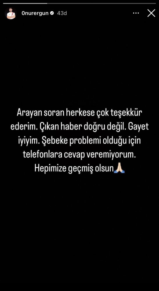 “Arayan soran herkese teşekkür ederim. Çıkan haber doğru değil. Gayet iyiyim. Şebeke problemi olduğu için telefonlara cevap veremiyorum. Hepimize geçmiş olsun.”