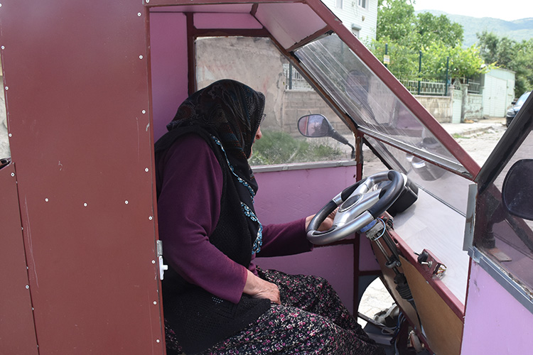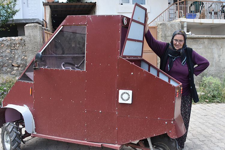 “Başkasının telif hakkına girmeyelim diye özel tasarım yaptık. Bunu da başardık. Annemin işini görecek konumda oldu. Annem de kullanıyor. Aracın parçası olarak konserve kutusu bile kullandım. Kullandığım şeyler o an elimize gelen, pratik olan malzemeler. Kalemi sinyal kolu olarak kullandım. Konserve kutusunu da korna olarak kullandım. Annem bütün işlerini bu araçla yapıyor. Annem yorulmasın diye yaptım. Yaşı 72 oldu. Dizleri de tutmuyor.”