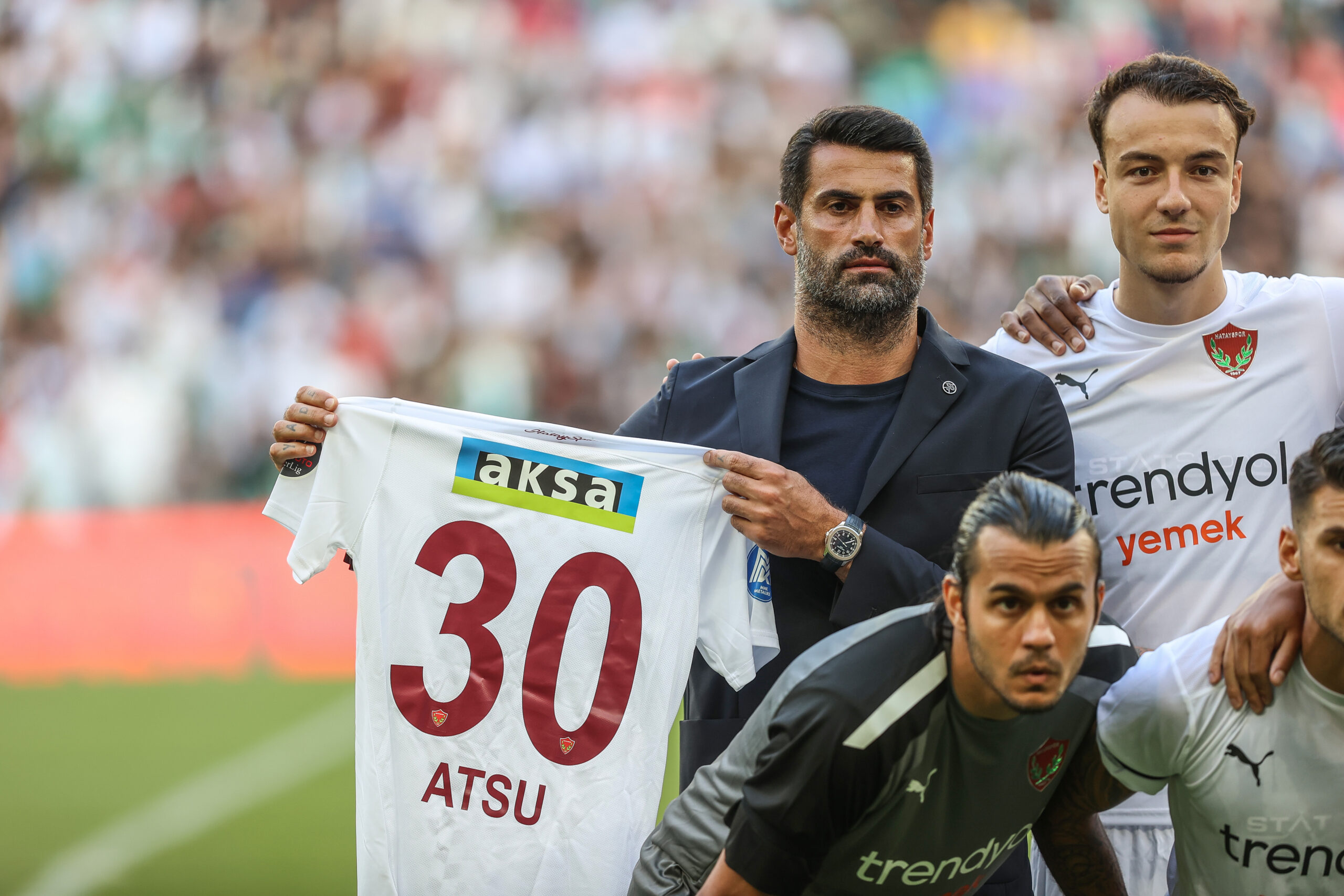 Demirel, depremde hayatını kaybeden Hataysporlu futbolcu Atsu’nun sahanın ortasına koyulan 30 numaralı formasını alıp, takım fotoğrafında elinde tuttu.