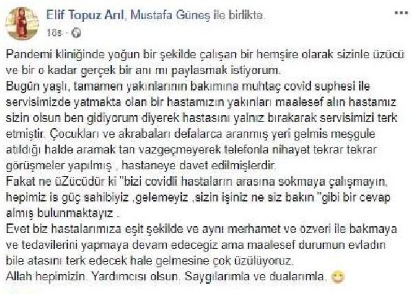 “Pandemi kliniğinde yoğun bir şekilde çalışan bir hemşire olarak sizinle üzücü ve bir o kadar gerçek bir anı mı paylaşmak istiyorum. Bugün yaşlı, tamamen yakınlarının bakımına muhtaç Covid şüphesi ile servisimizde yatmakta olan bir hastamızın yakınları maalesef, ‘Alın hastamız sizin olsun ben gidiyorum’ diyerek hastasını yalnız bırakarak servisimizi terk etmiştir. Çocukları ve akrabaları defalarca aranmış, yeri gelmiş meşgule atıldığı halde aramaktan vazgeçmeyerek telefonla nihayet tekrar tekrar görüşmeler yapılmış, hastaneye davet edilmişlerdir. Fakat ne üzücüdür ki; ‘Bizi Covidli hastaların arasına sokmaya çalışmayın, hepimiz is güç sahibiyiz, gelemeyiz. Sizin işiniz ne? siz bakın” gibi bir cevap almış bulunmaktayız. Evet biz hastalarımıza eşit şekilde ve aynı merhamet ve özveri ile bakmaya ve tedavilerini yapmaya devam edeceğiz ama maalesef durumun evladın bile atasını terk edecek hale gelmesine çok üzülüyoruz. Allah hepimizin yardımcısı olsun.”