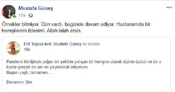 Daha önce sosyal medya hesabından yaptığı ‘Virüs kaparım’ korkusuyla anne-babasını almaya bile yanaşmayanlar olduğunu ifade ettiği paylaşımıyla dikkatleri çeken Darıca Farabi Eğitim Araştırma Hastanesi Başhekim Doç. Dr. Güneş de hemşirenin paylaşımını, kendi hesabından, “Örnekler bitmiyor. Dün vardı, bugün de devam ediyor. Hastanemde bir hemşiremin izlenimi. Allah ıslah etsin” diyerek, paylaştı.