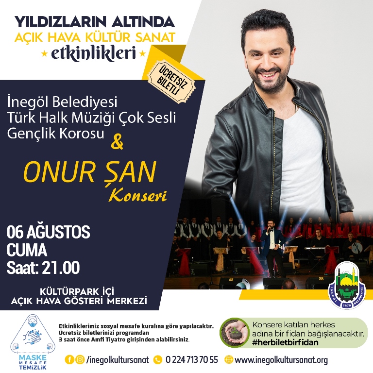 Son günlerde yaşanan orman yangınları nedeniyle Yıldızların Altında Açık Hava Kültür Sanat etkinliklerinin bir kısmı iptal olmuştu. İnegöl Belediyesi, 6 Ağustos Cuma gecesi Kültür Park İçerisindeki Amfi Tiyatroda düzenlenecek olan Onur Şan konserini bir sosyal destek kampanyasına dönüştürdü. Yapmış olduğu kültür ve sanat etkinliklerini ücretsiz ve biletli olarak gerçekleştiren İnegöl Belediyesi bu konseri de ücretsiz olarak düzenliyor. Etkinlik biletleri programdan 3 saat öncesinde amfi tiyatro girişinde dağıtılmaya başlanacak.