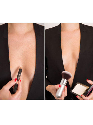 Göğüslerinizdeki sivilce veya lekeleri kapatmak için, cilt tonunuzla eşleşen bir kapatıcıyı sorunlu bölgelere sürün ve saydam bir pudrayla üstünden geçin..