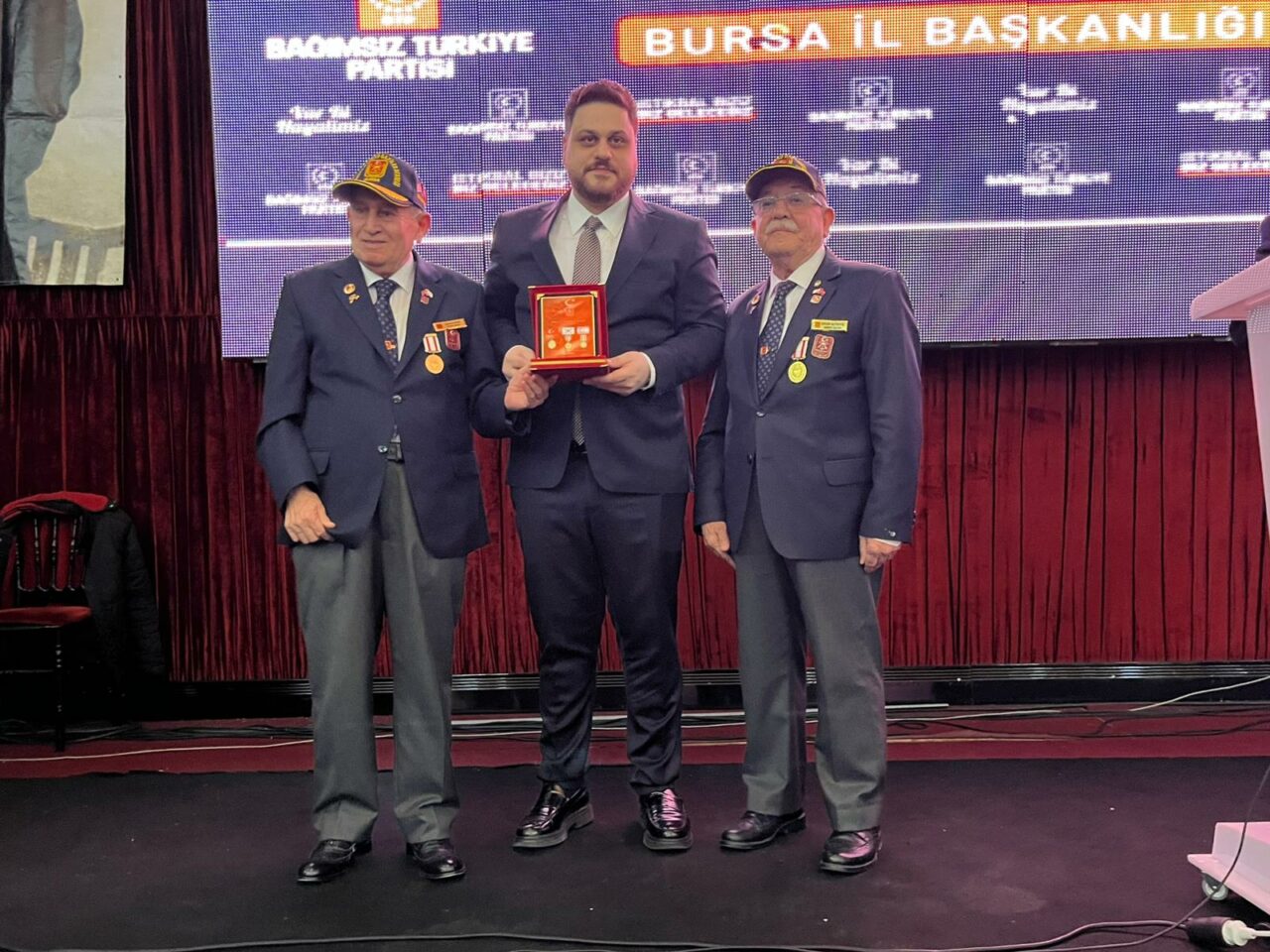 Konuşmanın ardından BTP Bursa İl Başkanı Mehmet Zeki Garazoğlu tarafından Hüseyin Baş’a plaket takdim edildi. Programda ayrıca gazilere ve gençlere yönelik plaket ve teşekkür sunumları da gerçekleştirildi.