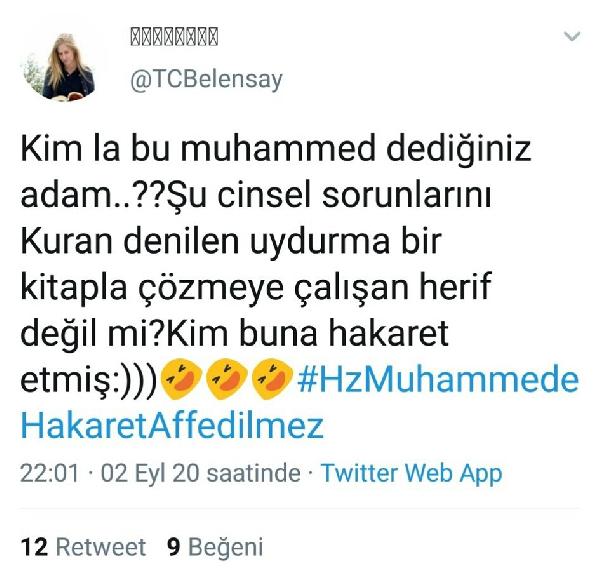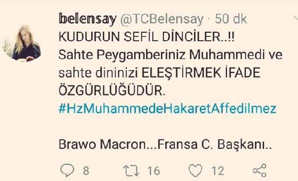 Sosyal medyada ‘tcbelensay’ isimli kullanıcı, Hz. Muhammed’e hakaret eden Charli Hebdo dergisi ile ilgili Fransa Cumhurbaşkanı Emmanuel Macron’un açıklamalarına destek vererek İslam’a ve Hz. Muhammed’e hakaret içerikli paylaşımlar yaptı. Hz. Muhammed hakkında ‘Sahte Peygamber’ ibaresini kullanan E.M.’ye tepki yağdı.