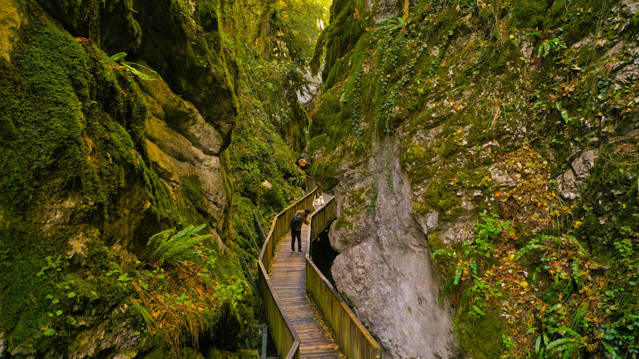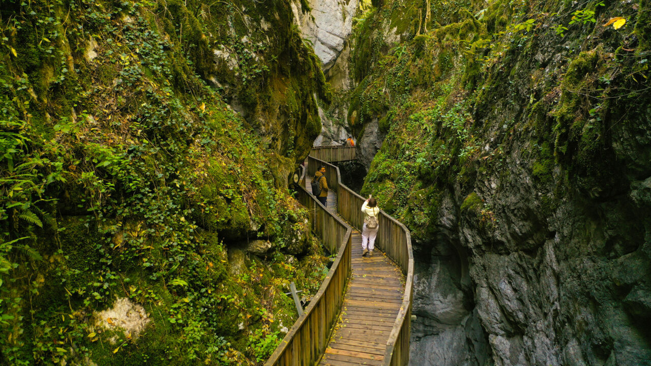Dev kayalıklar arasından ahşap platformu kullanan ziyaretçiler, güz renklerine bürünen kanyonun tüm güzelliklerini görebiliyor.