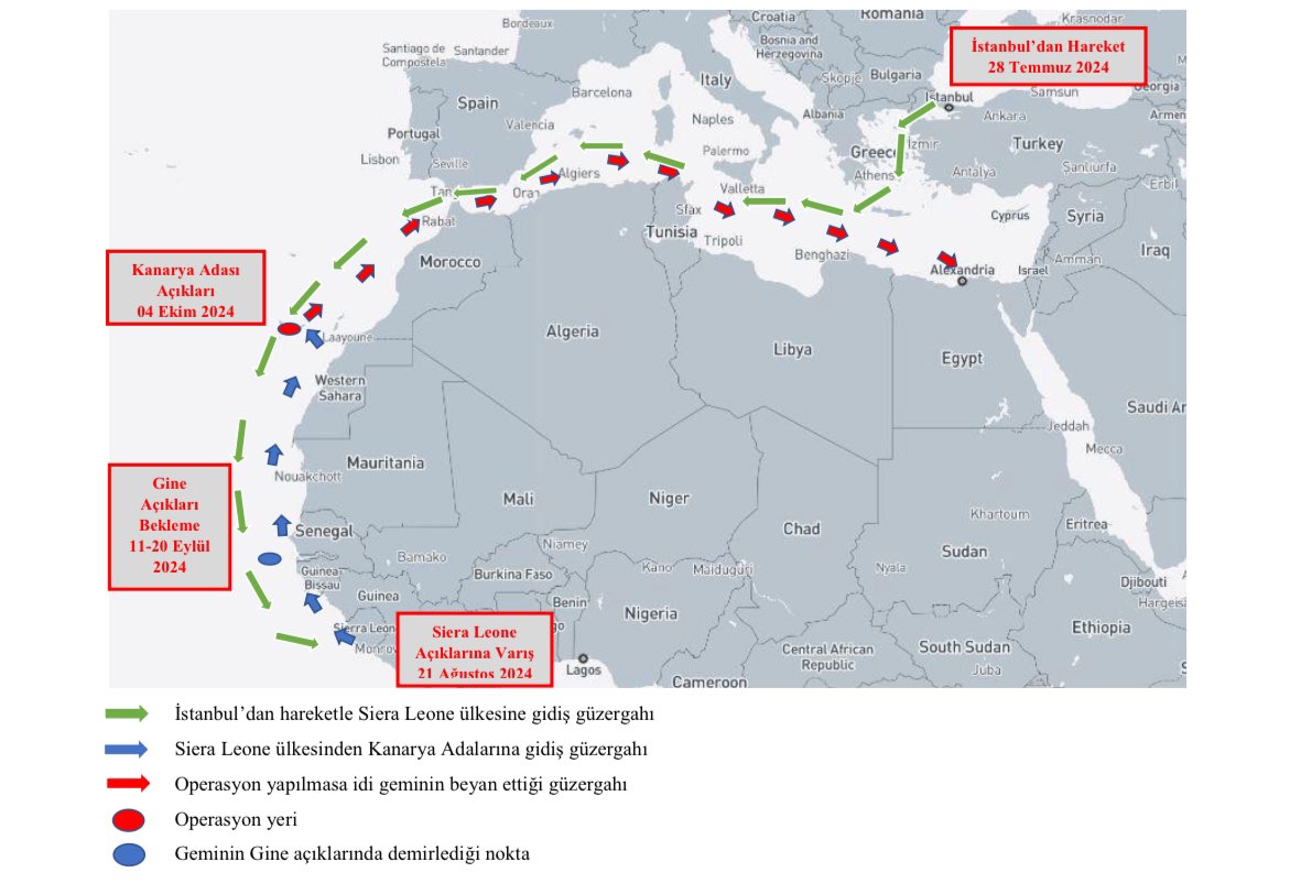 “28 Temmuz 2024 tarihinde İstanbul Zeytinburnu açıklarındaki demirleme alanından ayrıldığı ve 9-10 Ağustos 2024 tarihlerinde Fas’ın Kazablanka kentinde kısa bir mola vererek Sierra Leone’ye transit geçiş yaptığı, 21 Ağustos’ta Freetown, Sierra Leone açıklarında demirlediği ve 11 Eylül’e kadar 20 gün boyunca orada kaldığı, 11 Eylül’de kuzeye doğru hareket ettiği ve 13-20 Eylül tarihleri arasında Gine ile Gine-Bissau ülkeleri karasularında limana giriş izni için beklediği ve akabinde 21 Eylül tarihinde 21 saat boyunca Bissau limanında demirlediği, 22 Eylül tarihinde Bissau limanından ayrıldıktan sonra, bir sonraki uğrak limanı olarak İskenderiye, Mısır’ı gösterdiği ve tahmini varış zamanını 15 Ekim 2024 olarak belirlediği, 23-24 Eylül 2024 tarihleri arasında Gine-Bissau açıklarında düşük hızda manevralar gerçekleştirdiği, 26 Eylül 2024 tarihinde Moritanya açıklarında seyrettiği, 28-29 Eylül 2024 tarihleri arasında Moritanya açıklarında hızını önemli ölçüde düşürdüğü, akabinde gemi İskenderiye Limanı’na seyir halindeyken Kanarya Adaları’nın kuzeydoğusundaki sularda 4 Ekim 2024 tarihinde İspanya ve Fransa güvenlik birimlerince operasyon yapılarak limana çekildiği ve 4 ton kokain maddesi ele geçirildiği bilgileri edinilmiştir.”