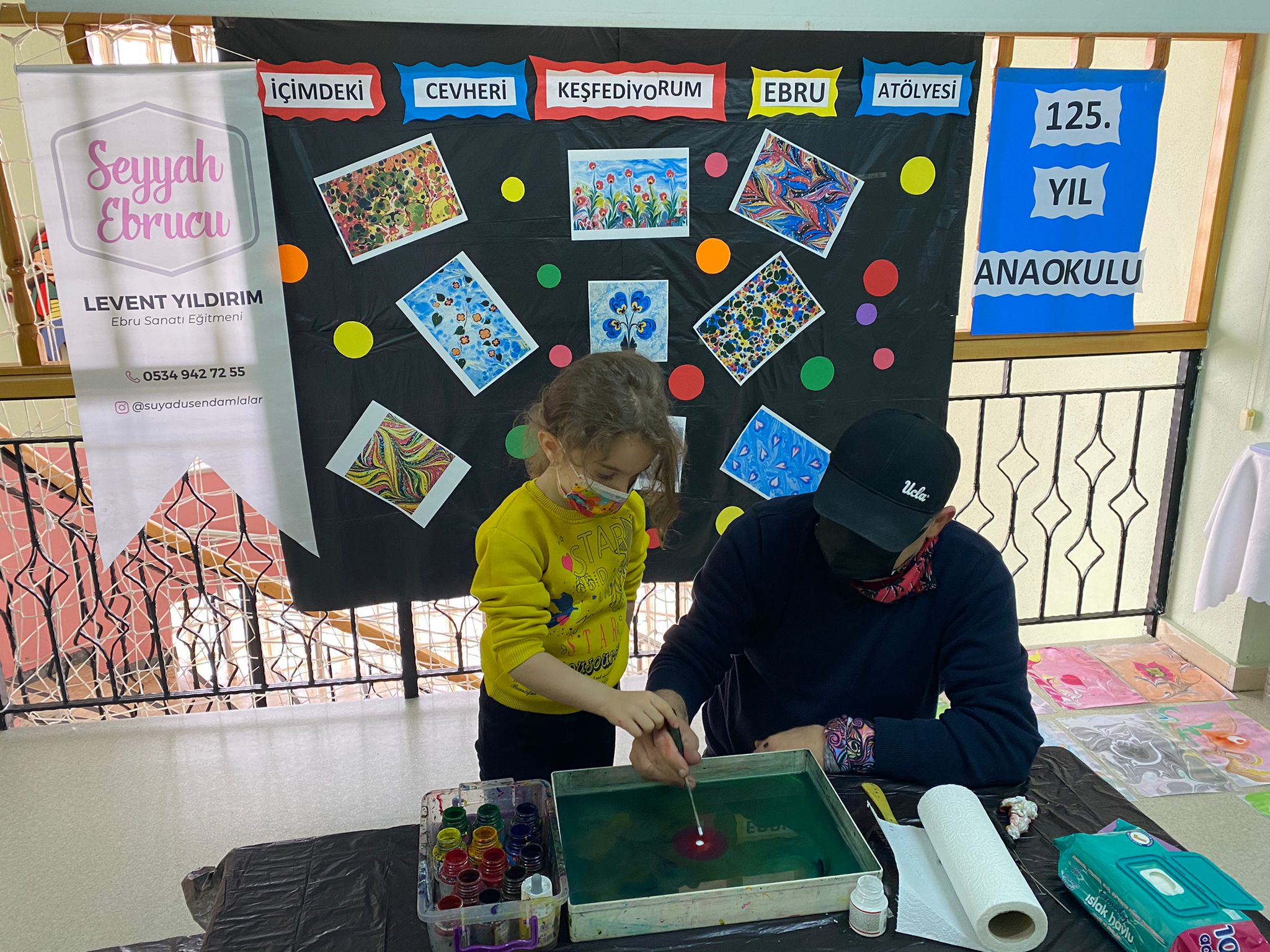 Kendisini ‘Seyyah Ebrucu’ olarak tanıtan emekli öğretmen Levent Yıldırım’ın destekleriyle okulda oluşturulan ebru atölyesinde, minik öğrencilere ebru sanatı ve kullanılan malzemeler hakkında bilgi verildi.