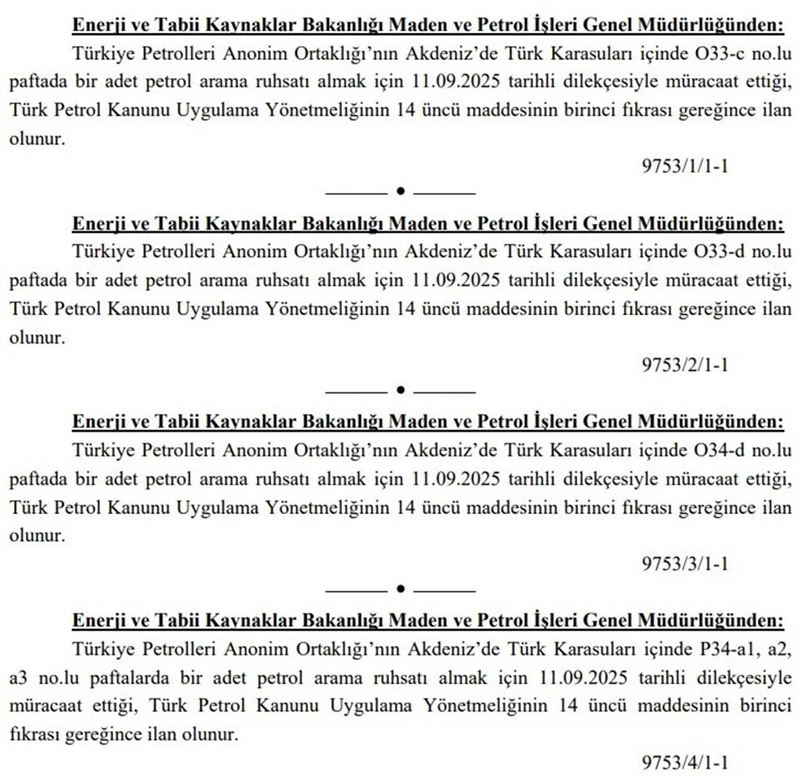 Enerji ve Tabii Kaynaklar Bakanlığı kapsamında gerçekleştirilen arama faaliyetleri kapsamında Türk Karasuları içinde yer alan Akdeniz’de Mersin ve Adana açıklarında Türkiye Petrolleri Anonim Ortaklığı bazı müracaatlarda bulundu.