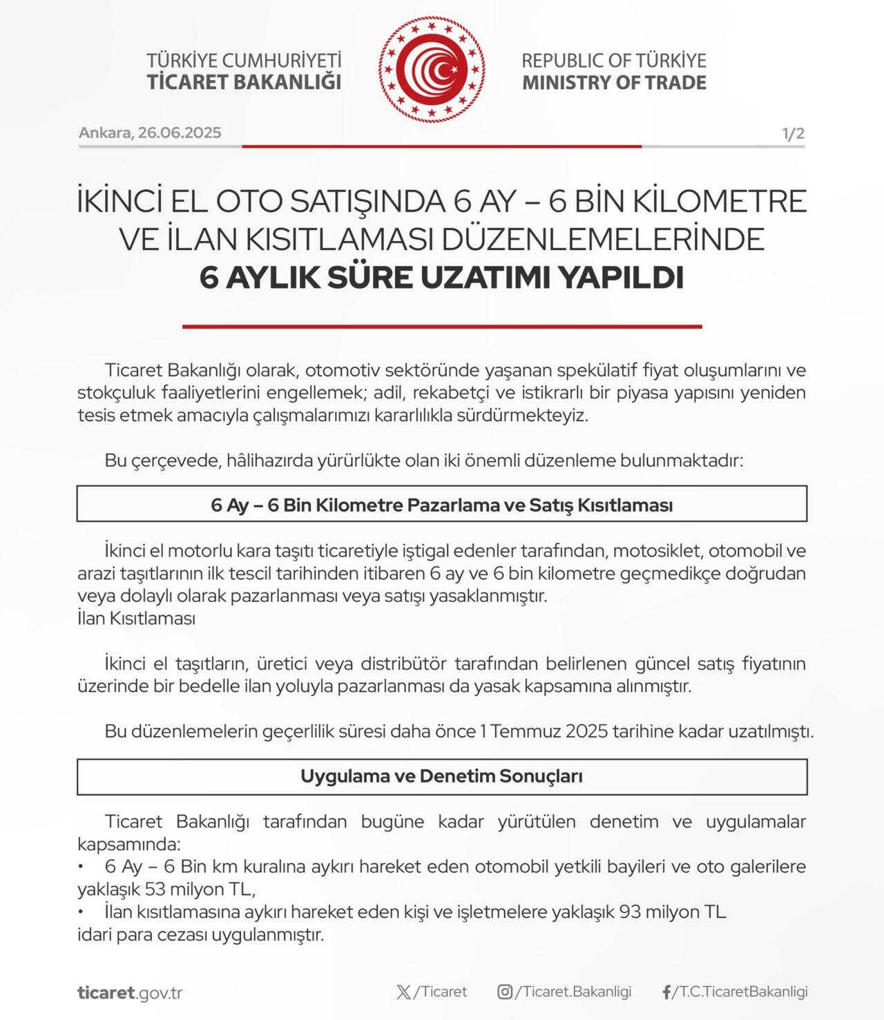 Ana Sayfa › Ekonomi › İkinci el oto satışında o süre uzatıldıİkinci el oto satışında o süre uzatıldı Ticaret Bakanlığı, ikinci el oto satışında 6 ay-6 bin kilometre düzenlemesinde sürenin 1 Ocak 2026 tarihine kadar uzatıldığını duyurdu. Giriş: 26-06-2025 18:01Kaynak: HABER MERKEZİ Ekonomi ABONE OL + - Ticaret Bakanlığı’ndan şu açıklama yapıldı: HABERİ PAYLAŞ