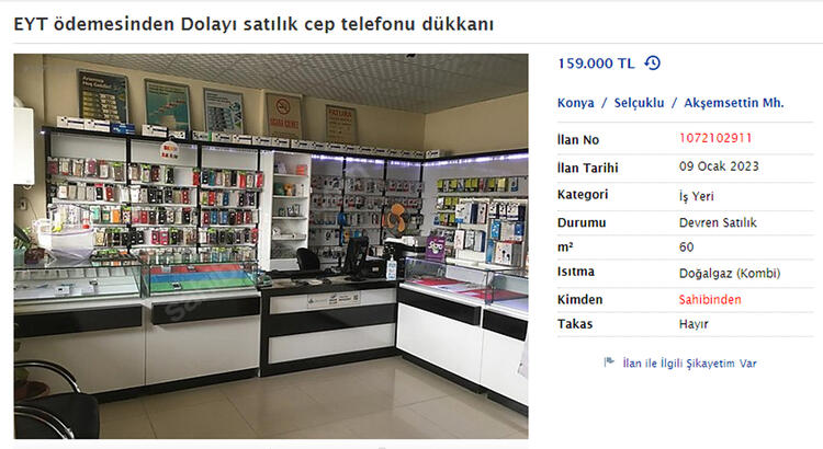 Konya Selçuklu’da bir kişi ise ‘EYT ödemesinden dolayı satılık cep telefonu dükkanı’ şeklinde verdiği ilan ile 60 metrekarelik dükkanını 159 bin TL’ye satışa çıkardı.