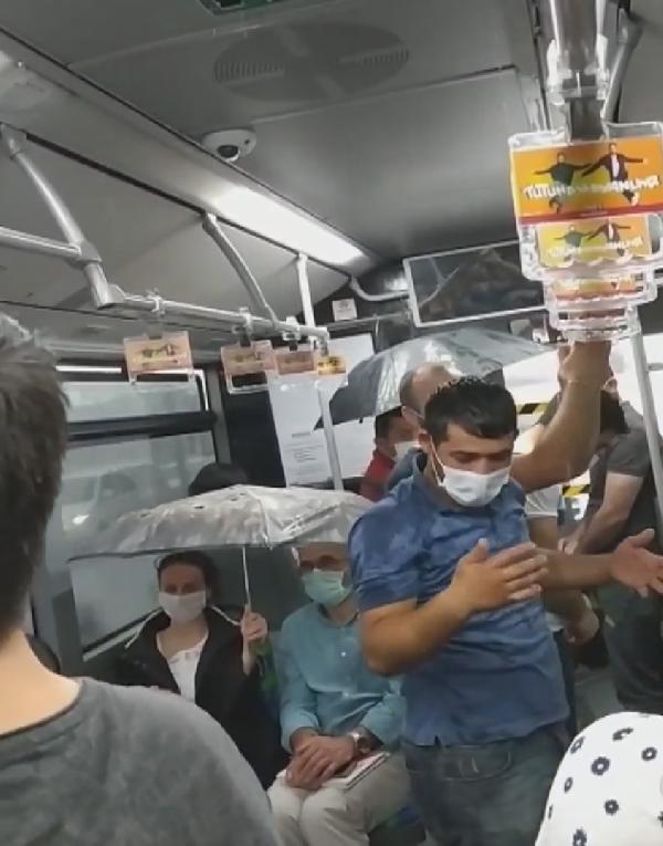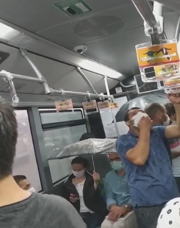 Metrobüs tavanından damlayan yağmur vatandaşların üzerine aktı. Bazı yolcuların yağmur sularından korunmak içinde şemsiye açtı.