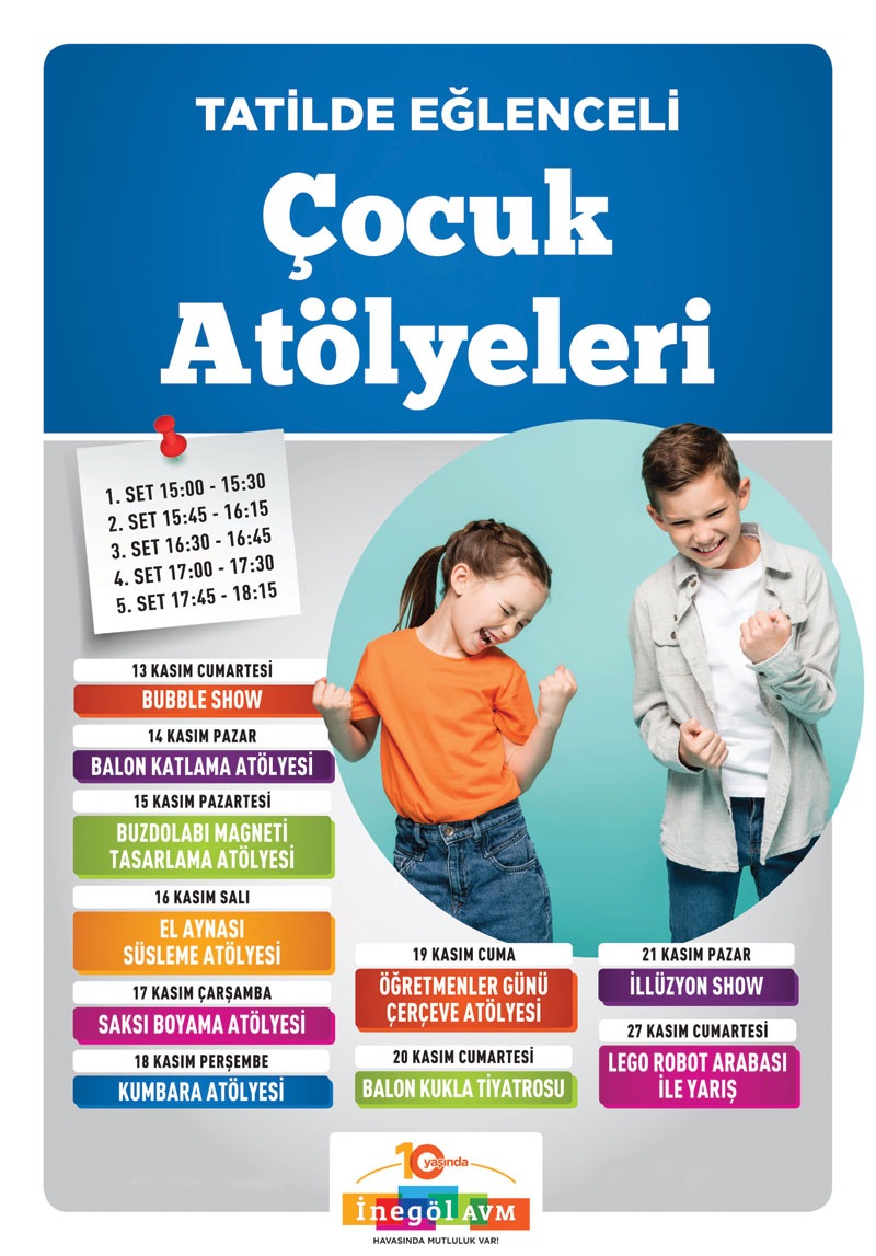 Bölgenin hem ekonomisine hem de sosyal yaşamına önemli bir katma değer sağlayan İnegöl AVM, ay boyunca planladığı atölye programları ile çocukların ara tatilini renklendiriyor. Alışveriş Merkezi; Balon Katlama Atölyesi, Buzdolabı Magneti Tasarlama Atölyesi, El Aynası Süsleme Atölyesi, Saksı Boyama Atölyesi, Kumbara Atölyesi, Öğretmenler Günü Çerçeve Atölyesi ile çocukların ve ziyaretçilerin hoş vakit geçirmesini sağlarken, aynı zamanda el becerilerini de kuvvetlendiriyor. Pandemi şartlarına göre hazırlanan etkinlik alanlarında, mesafe kurallarına, maskeye ve seans araları dezenfekte işlemlerine özenle dikkat ediliyor.
