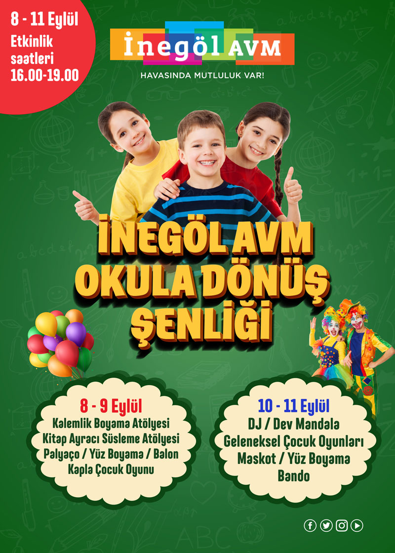 İnegöl AVM’de 8-11 Eylül arasında Okula Dönüş Şenliği gerçekleşecek. Şenlik kapsamında; çocuklara özel kalemlik boyama atölyesi, palyaço, yüz boyama, balon dağıtımı, kapla çocuk oyunu; kitap ayracı süsleme atölyesi, geleneksel çocuk oyunları, maskot, Dev Mandala, Bando etkinlikleri gerçekleşecek. Tüm etkinlikler saat 16:00 ile 19:00 saatleri arasında İnegöl AVM meydanında olacak.