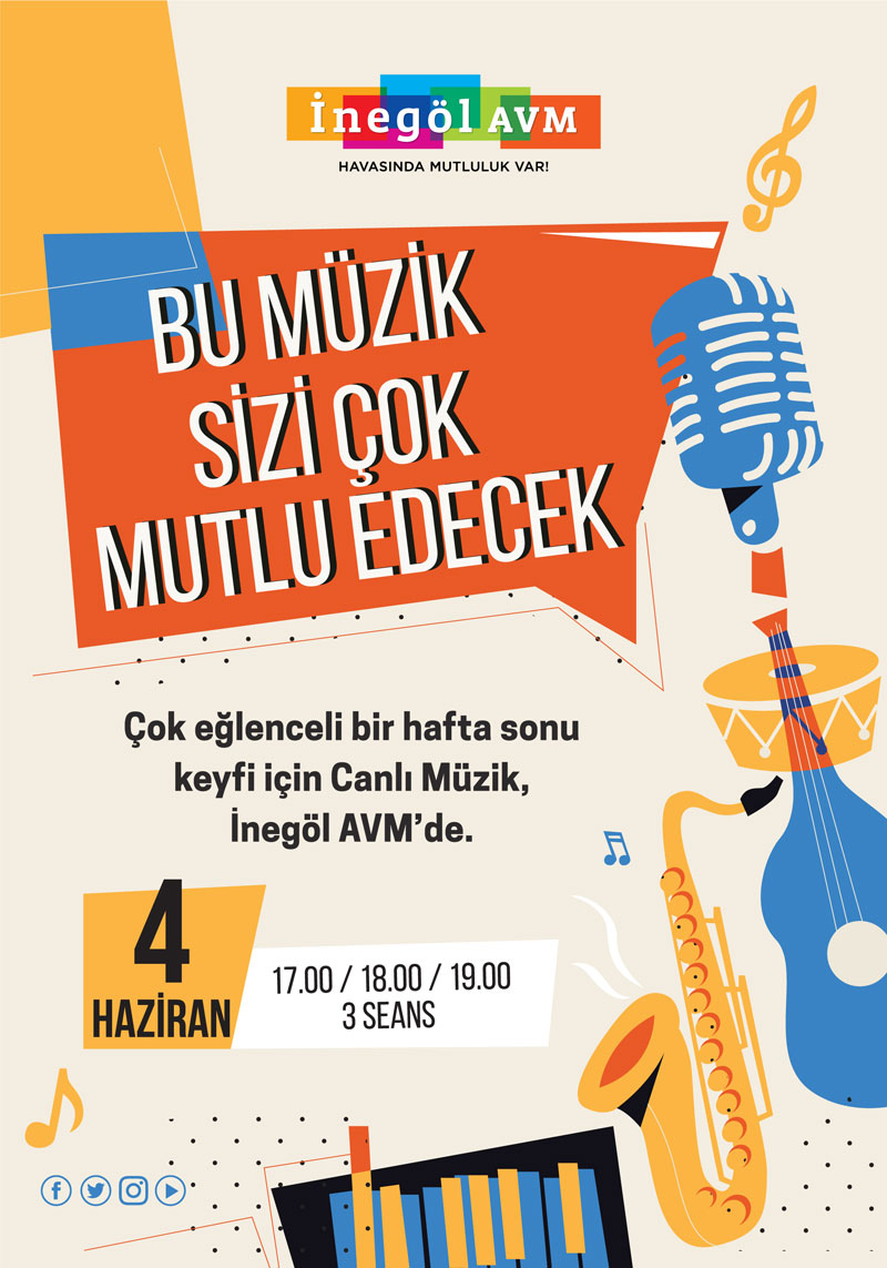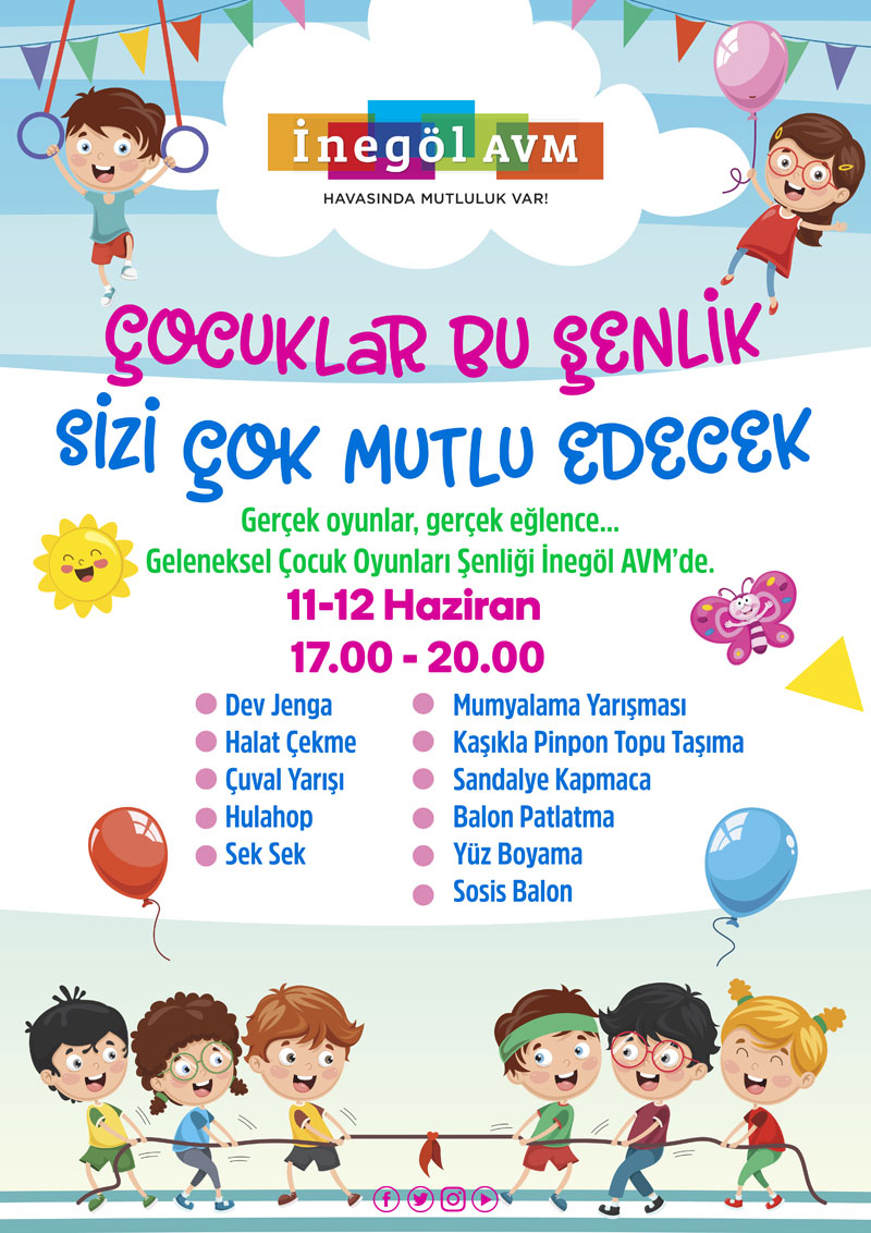 İnegöl AVM’de 4 Haziran’da Canlı Müzik etkinliği, 5 Haziran’da Dünya Çevre Günü’ne özel Çiçek Dikim Çocuk Atölyesi, 11-12 Haziran’da Geleneksel Çocuk Oyunları Şenliği gerçekleşecek. 17.00 ile 20.00 saatleri arasında gerçekleşecek şenlikte; Dev Jenga, Halat Çekme, Çuval Yarışı, Hulahop, Sek sek oyunu, Mumyalama Yarışması, Kaşıkla Pinpon Topu Taşıma, Sandalye Kapmaca, Balon Patlatma, Yüz Boyama, Sosis Balon gibi etkinlikler çocukları bekliyor olacak.
