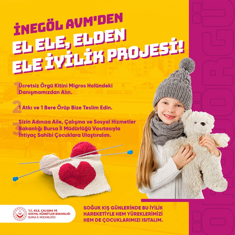 Bölge için yüksek değer üreten ve ‘sorumlu marka’ anlayışıyla hareket eden İnegöl AVM’nin El Ele Elden Ele İyilik Projesi soğuk kış günlerinde çocukları ısıtmaya devam ediyor. İnegöl AVM Migros Hall’ündeki danışma tarafından ücretsiz verilen örgü kiti ile 1 atkı ve 1 bere ören ziyaretçiler ördüklerini AVM yönetimine teslim ediyor. Örgü ürünler ören kişilerden teslim alındıktan sonra Aile, Çalışma ve Sosyal Hizmetler Bakanlığı Bursa İl Müdürlüğü tarafından ihtiyaç sahibi çocuklara ulaştırılıyor.