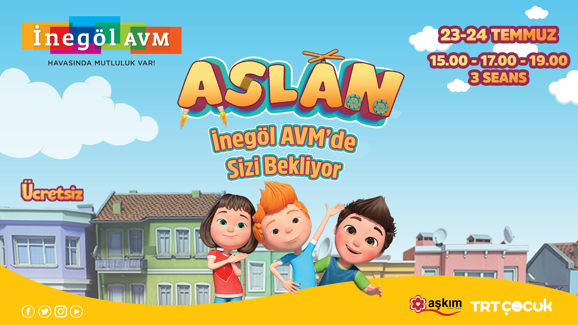 İnegöl AVM’de 23-24 Temmuz’da “Aslan” lisanslı çocuk etkinliği, 15.00,17.00 ve 19.00 saatlerinde 3 seans halinde yapılacak. Aslan çizgi filminin müzikli gösterisine tüm çocuklar etkinlik alanında katılabilecek. Gösteride farklı sorunlar için yeni araçlar hayal eden Aslan’ın merak ettiği konuları dedesinin yardımı ile çözdüğü hikayeleri yer alacak. 30-31 Temmuz’da Cemal Ustaoğlu Origami Atölyesi etkinlikleri 17:00 -20:00 saatleri arasında beşer seans olacak şekilde gerçekleşecek.