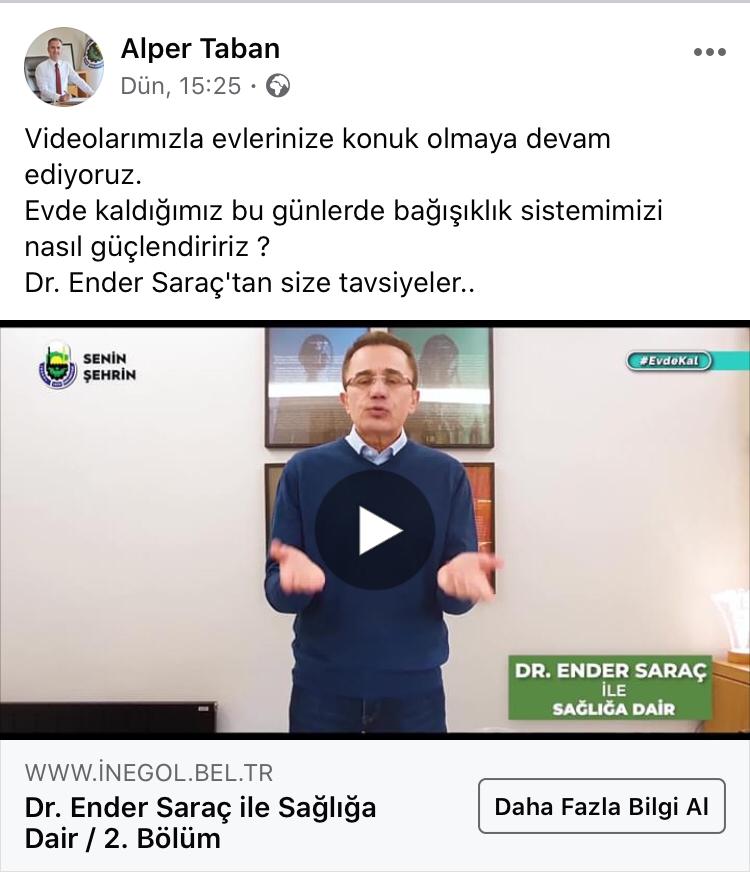 Farklı konu ve başlıklarla karantina günlerini sağlıklı ve en iyi şekilde geçirmeyi sağlamak amacıyla hazırlanan videolar, her gün İnegöl Belediyesi ve İnegöl Belediye Başkanı Alper Taban’ın sosyal medya hesapları üzerinden izleyicileriyle buluşuyor.