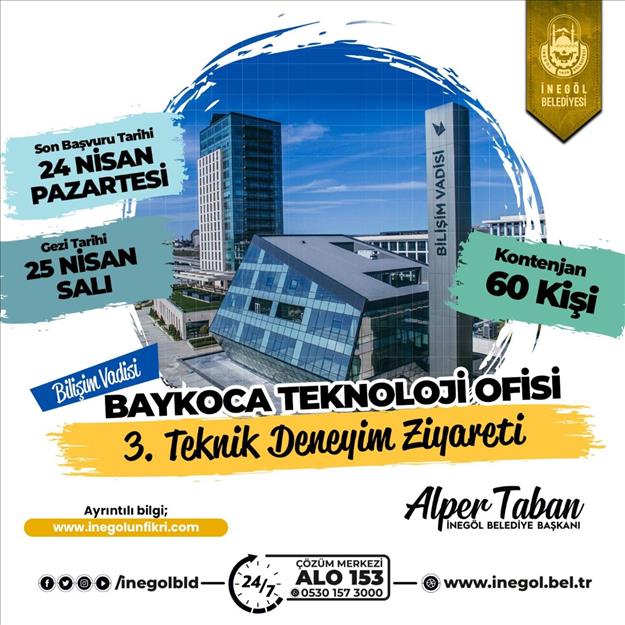 İnegöl Belediyesi, Baykoca Çalışma Ofisinin açılmasının ardından yerli ve milli teknoloji hamlesine katkı sunan çalışmalarının olgunlaştırılarak hayata geçirildiği Bilişim Vadisine Teknik Deneyim Gezileri düzenlemeye başladı. Amacı yerli ve milli teknoloji hamlesi çalışmalarına katkı sunan vizyoner projelerin bilim meraklıları ve özellikle gençler tarafından yerinde incelenmesi, teknoloji odaklı fırsat ve imkanların yerinde görülmesi, kariyer adımlarında gençlerin karar vermesine katkı sunmak ve İnegöl’ün bu alanda yaptığı çalışmalara dair farkındalık oluşturmak olan gezi, daha önce 2 defa gerçekleştirildi. Bilişim Vadisi Baykoca Teknoloji Ofisi 3. Teknik Deneyim Ziyareti için de kayıtlar alınmaya başladı.