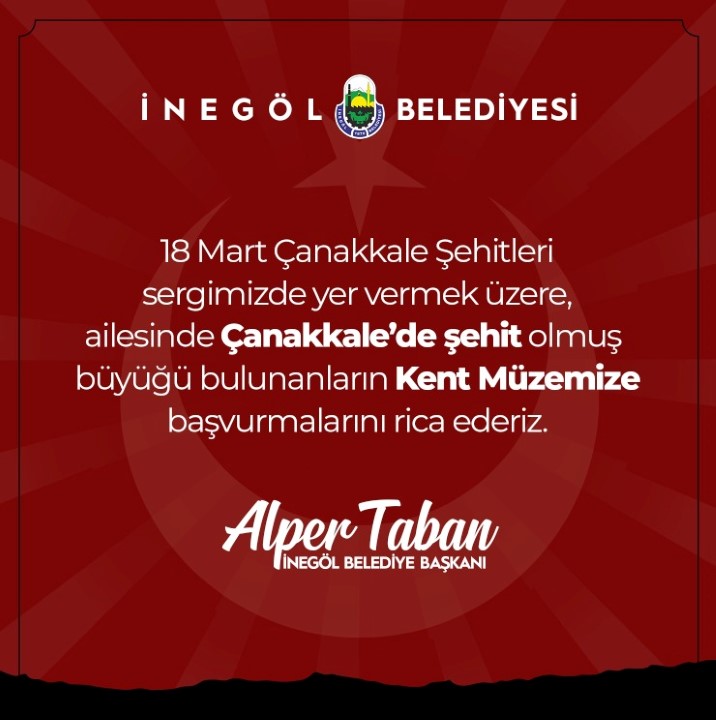 Kent Müzesinden yapılan açıklamada, Çanakkale’de şehit veya gazi olmuş büyükleri bulunanlara çağrı yapıldı. 250 bin şehidin verildiği Çanakkale savaşında resmi kayıtlarda yer alan İnegöllü şehitlerle ilgili bilgilere ulaşıldığı ancak her bir şehidin isminin anılması adına ulaşılamayan şehitlerin ailelerinin Kent Müzesine başvurması adına yapılan çağrıda şu ifadelere yer verildi: “Milletimizin tüm cihanı dize getirdiği Çanakkale Savaşında 250 bin şehidimiz toprağa düştü. İnegöl’ümüzden de çok sayıda şehidimiz olduğunu biliyoruz. Çanakkale’de şehit veya gazi büyüğü bulunan ailelerimizin ellerinde herhangi bir fotoğraf, belge veya bir materyal bulunuyor ise Kent Müzemize gelerek başvurmalarını rica ediyoruz. Ellerinde herhangi bir belge olmasa dahi şehit yakını olan vatandaşlarımızın bizzat gelerek veya 0 224 713 18 70 numaralı telefondan sergide aziz şehitlerimizin isimlerine yer vermek adına ulaşmalarını rica ediyoruz.”