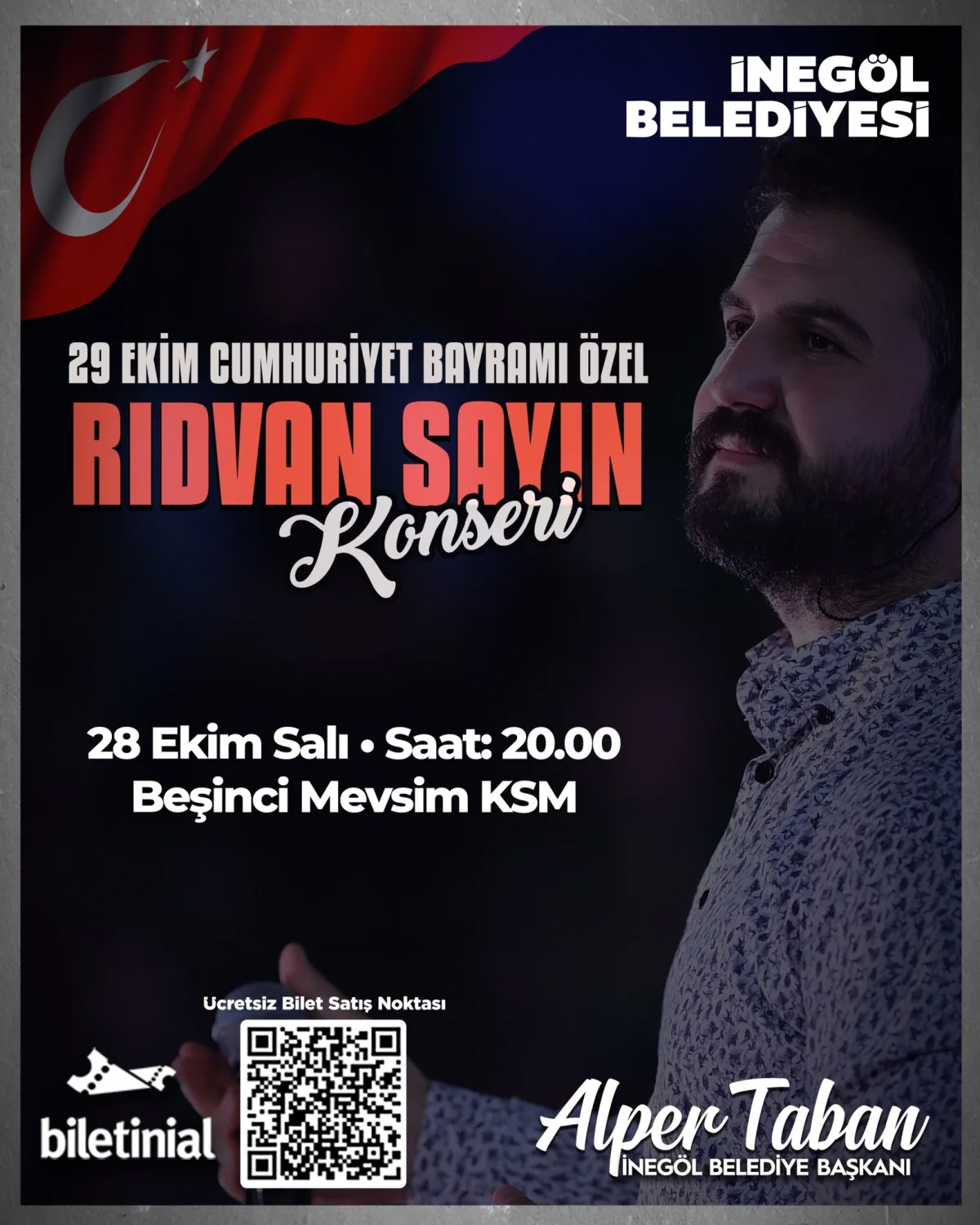 Cumhuriyetimizin ilanının 102’nci yılına özel etkinliklerle hazırlanan İnegöl Belediyesi, Cumhuriyet Bayramı Özel Konserinde Rıdvan Sayın ile ilçe halkını buluşturuyor. Kültür Bakanlığı sanatçısı Rıdvan Sayın, 29 Ekim Cumhuriyet Bayramı etkinlikleri kapsamında 28 Ekim Salı akşamı sahne alacak.
